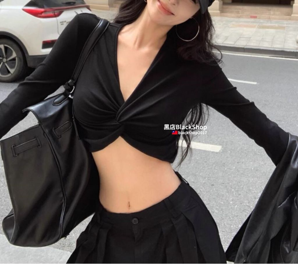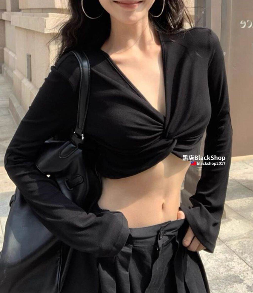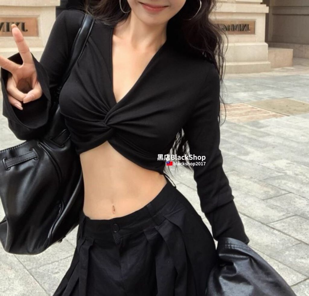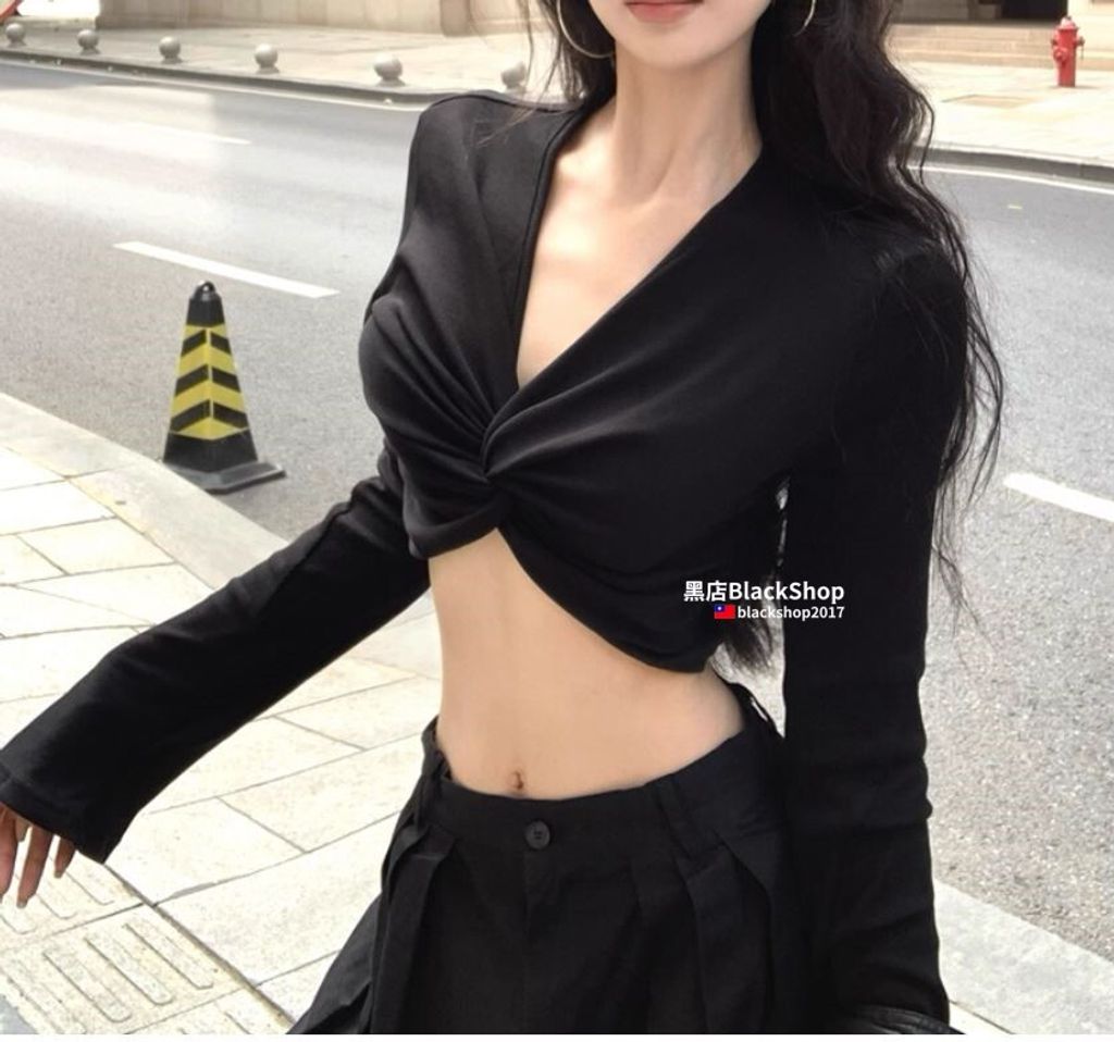 【黑店】黑色辣妹超短版V領長袖上衣 百搭露腰長袖上衣 黑色長袖深V上衣 御姐風性感長袖上衣 OT687