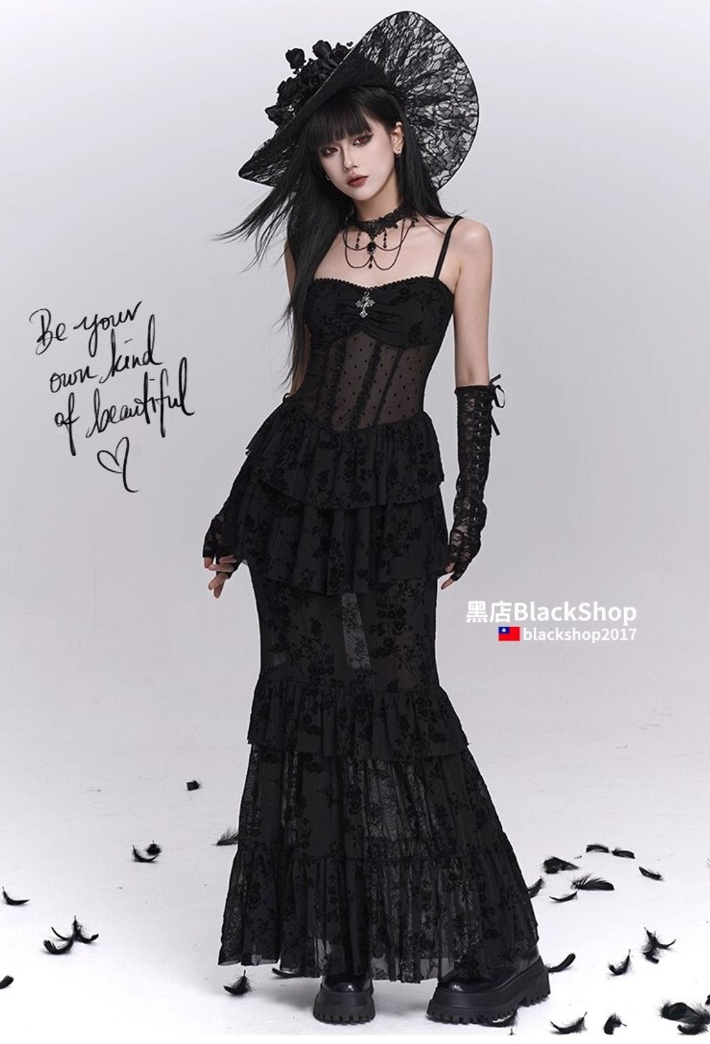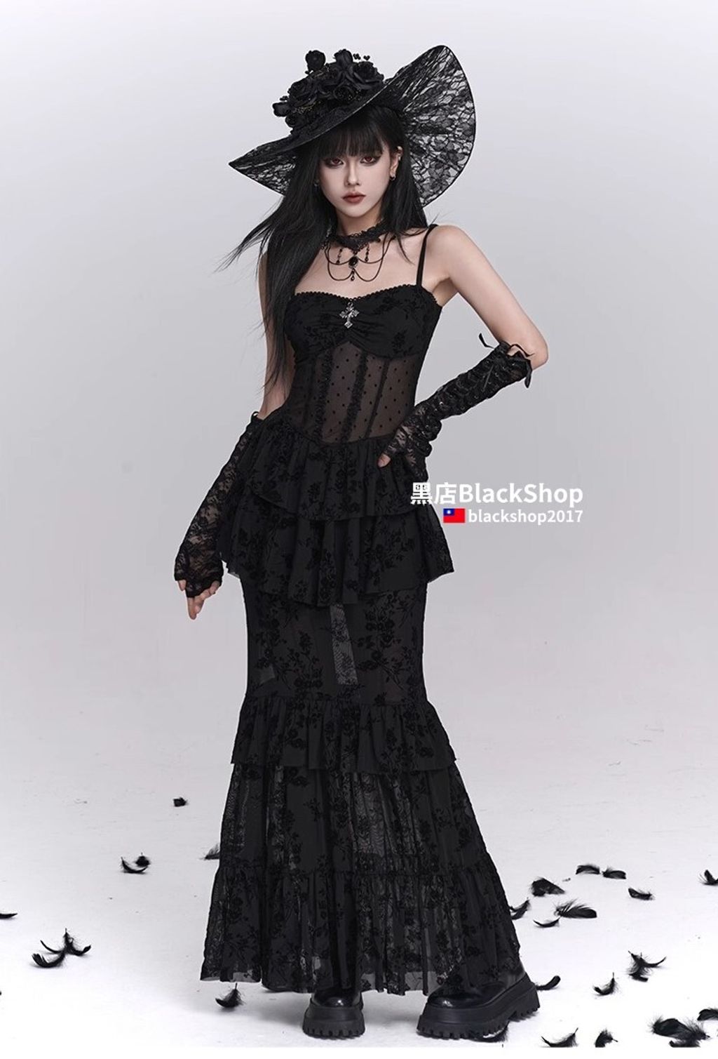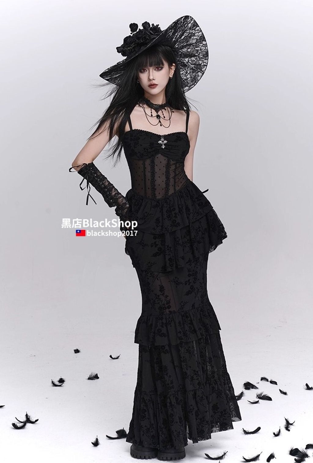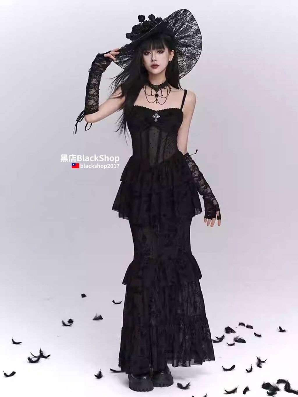 【黑店】暗黑系蕾絲網紗拼接吊帶長洋裝 十字架蕾絲細肩帶洋裝 性感蕾絲長裙洋裝 女巫系吊帶洋裝 YL144