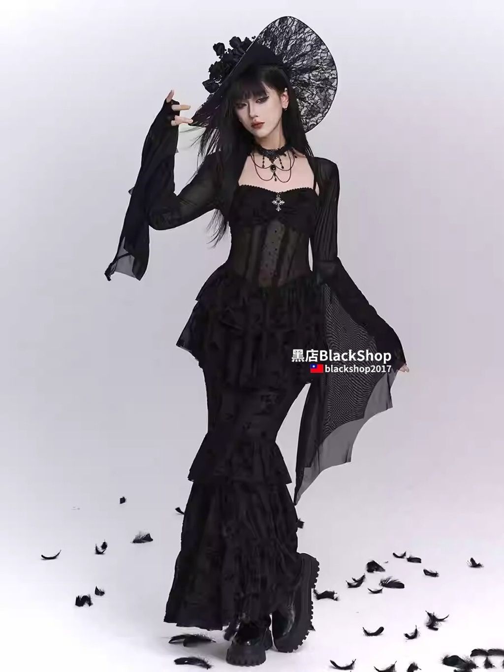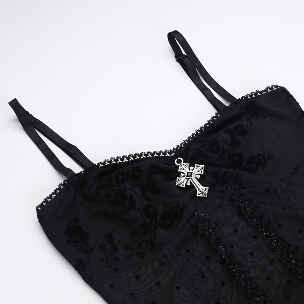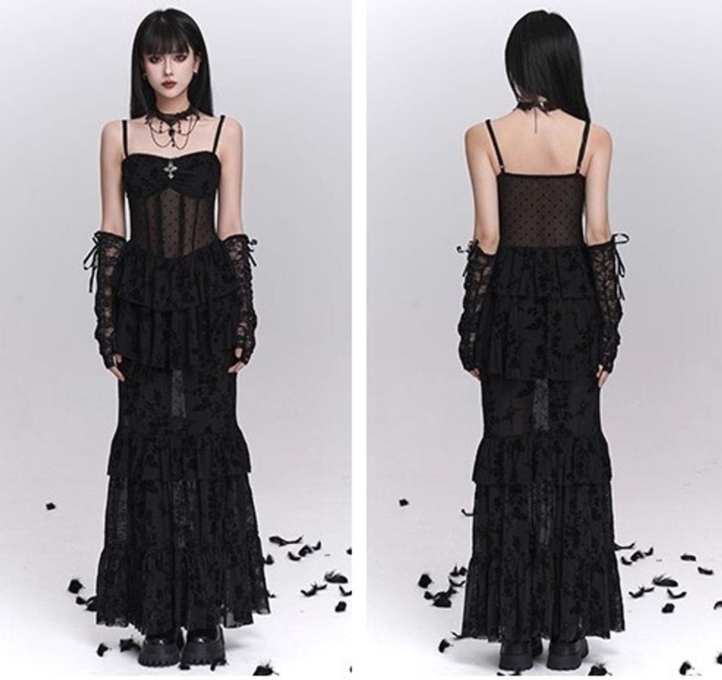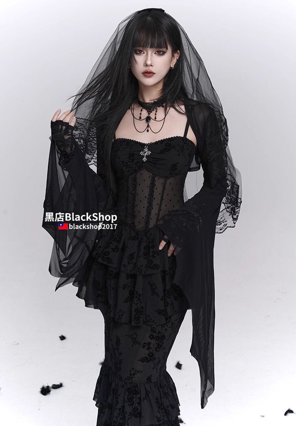 【黑店】暗黑系蕾絲網紗拼接吊帶長洋裝 十字架蕾絲細肩帶洋裝 性感蕾絲長裙洋裝 女巫系吊帶洋裝 YL144